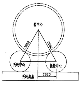 (2)利用窑安装时在托轮座底盘上作的窑中心线原始标记,用0.5mm细线,引一根窑筒体中心线作为校正托轮的基准线。左、右两边托轮中心到窑中心基准线的水平距离为1925mm。如图2所示。