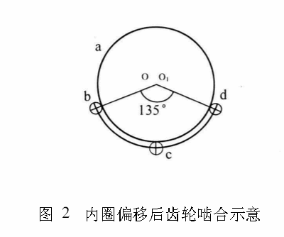 倾覆力矩容易造成回转支承的内圈向一边偏移,引起回转小齿轮与大齿圈的回转中心不同心(如图2,O是大齿圈的几何中心,是设计的回转中心,O1是内圈偏移后小齿轮的实际回转中心),造成回转小齿轮和大齿圈齿侧和齿顶间隙减小,齿轮啮合精度降低。