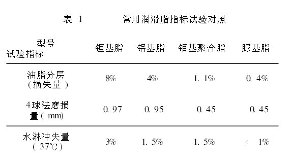 选用机械安定性与胶体安定性好、针入度适中的1#脲基脂替代以前使用的3#锂基脂,回转支承的润滑状况得到较大改善。从表1可以看出,脲基脂的性能优于其它常用润滑脂。