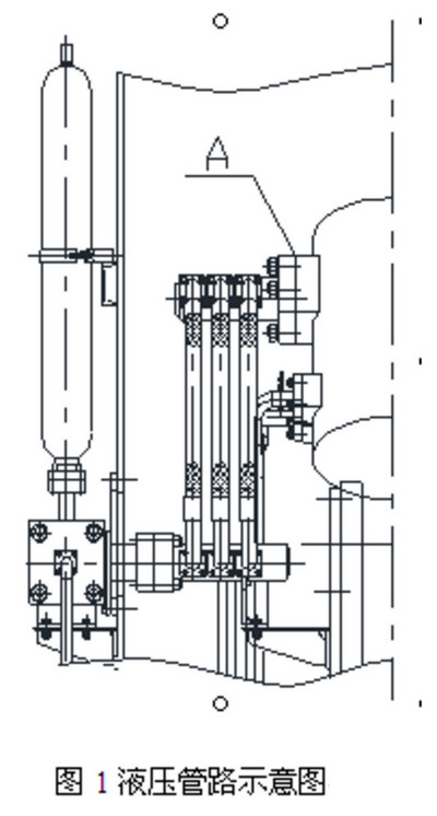 我公司自主研发的JLMS54水泥终粉立式辊磨机其装机功率为4200kW,自2012年6月正式在冀东水泥永吉公司生产线运行以来,PC42.5水泥产量维持在200t/h以上,比表为3600±100c㎡/g。该立磨在运行初期存在一个问题,即设备运行不到一星期,液压系统中的分油管和液压缸接合面处(见图1中A处)出现漏油现象,由于每次泄露漏损耗的油品较多,停机时间较长,严重影响了立磨的正常生产运行。所以本文主要针对A处的密封失效及损坏问题,进行原因分析,提出解决的方案。