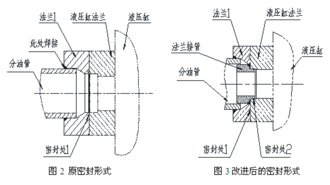 连接液压缸与固定油管间的高压胶管在液压系统较高压力(通常12MPa左右)作用下,会产生较大的管路外张力。液压缸工作时绕下部销轴做小幅频繁摆动,在上述管路张力的牵拉作用下,分油管的法兰1与液压缸法兰结合面处的端面密封形式(图2中密封处1)很容易失效导致漏油。同时立磨振动引起冲击,导致两法兰连接螺栓出现松动,若出现松动时未能及时紧固,也增加了A处向外泄漏液压油的机会。