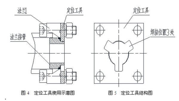 2)要保证法兰接管的轴向密封实现良好的密封效果,除了要求法兰1扩的内孔达到一定的圆柱度和垂直度要求以外,还有就是能否有一套比较完善的安装工艺。因为需要在现场完成法兰接管与法兰1的焊接工作,导致法兰接管和液压缸法兰的同轴度比较难保证,所以我们设计了专用的焊接定位工具来完成此项安装工作。该定位工具根据六点定位原理限制五个自由度,只有沿轴线方向的转动自由度没有限制。该定位工具可用普通钢板制作而成,其中心处开设有类似三角形花键键槽形状的通孔,边缘处开设有四个圆孔,其形状、位置尺寸与法兰1上紧固用的四个圆孔完全相同,如图5所示。实施焊接前先将法兰接管压入法兰1内腔到指定位置后再将定位工具穿过法兰接管小端部分,调整好位置后用法兰1上原先配有的螺栓将定位工具与法兰1固定住。然后在定位工具已留好的三处空腔实施三处断续焊,这样就完成了法兰接管的安装工作。如图4所示。液压管路重新安装完毕,在立磨运行过程中要加强巡检力度,定期检查,防止螺栓松动。