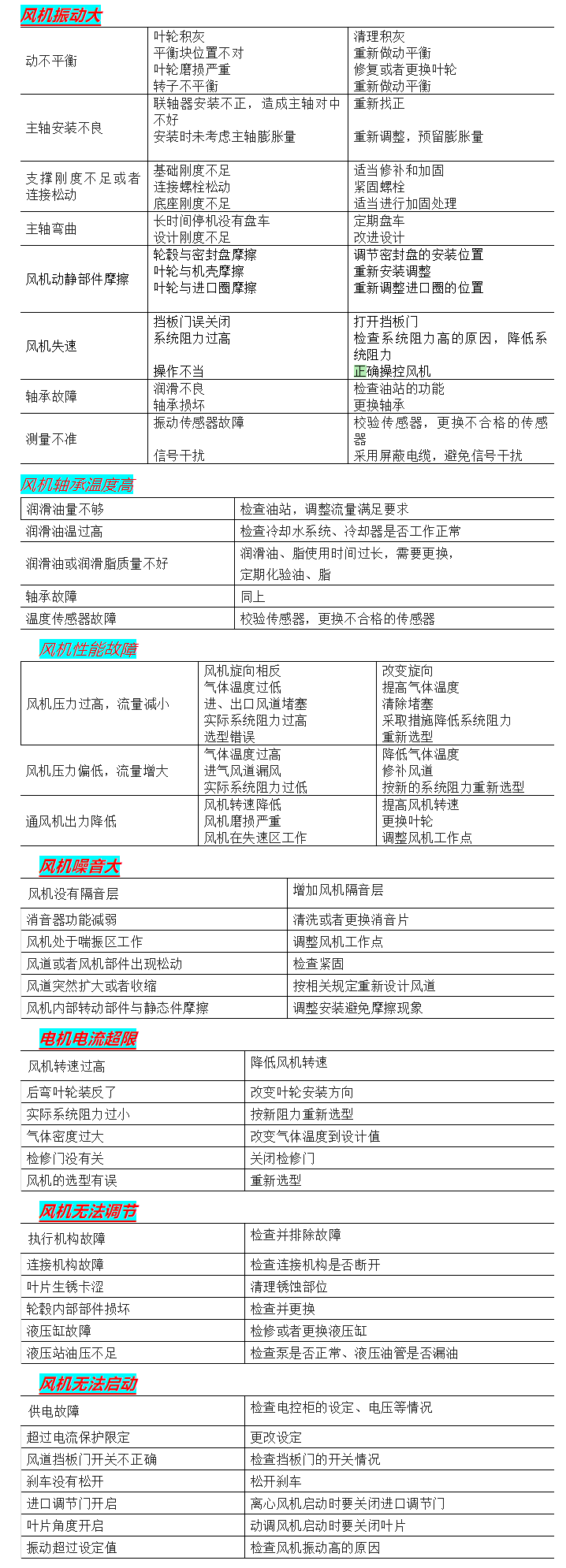 风机在运行中发生故障的原因很多,发生的部位也不同,故障可能是风机本身的问题,也可能是发生在风机的风道系统,还可能是电动机出现了问题。风机的故障与制造、安装工艺质量、检修水平、运行操作和维护计划是否符合要求有着密切的关系。下面就列举一些风机的常见故障及处理方法。