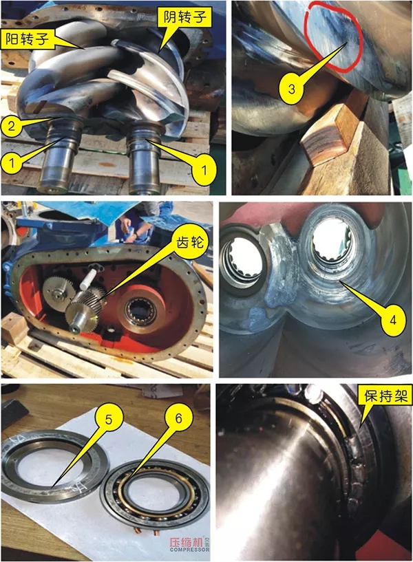 1.6 阳转子驱动端径向轴承保持架损坏,轴承滚柱变形、磨损并混乱排列。