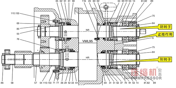 1.5 阳转子非驱动端调心滚子轴承(起轴向定位作用)外圈与定位盘磨损(见标注5)轴承外圈安装定位环上的销钉已变形(见标注6)