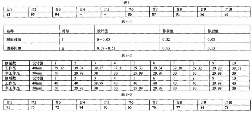 本次检修对推力盘漂偏进行检查,Z大值为0.03mm;对推力瓦进行检查时发现推力瓦工作面瓦块存在着严重电腐蚀及磨损现象,推力间隙偏大,并测量各推力瓦块厚度如表2-2,综合运行期间推力瓦温度超标,对工作面推力瓦块进行更换,根据标准值调整推力间隙;