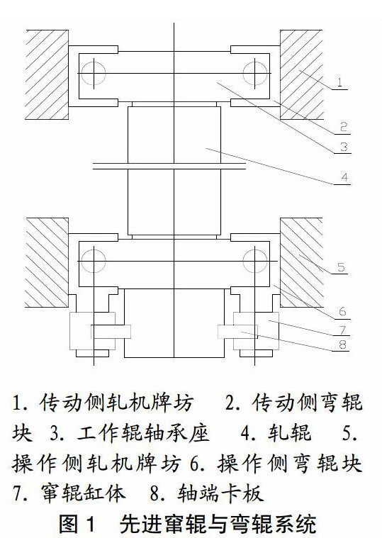 国外先进的窜辊结构,弯辊缸体与轧机牌坊固定在一起,窜辊缸活塞杆与弯辊缸体是整体结构,窜辊时弯辊缸体不动,窜辊缸体带动轧辊轴向窜动。其先进窜辊与弯辊系统示意图见图1所示: