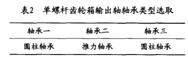 说明:Fr与Fa分别表示输出轴所受的径向载荷与轴向载荷;以上轴承均为滚子轴承。从表中可以看出,齿轮箱输出轴当前的几种轴承布置型式均选取了推力滚子轴承,由于推力滚子轴承内外圈为分体结构,无法起定位作用,故其仅能承受螺杆所受的轴向力,不参与轴系的定位。结合图2可以看出,除推力滚子轴承之外的两个轴承起到定位整个齿轮箱输出轴系的作用,同时承受径向力与弯矩。