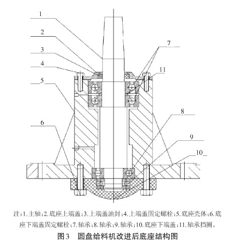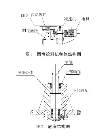 原使用圆盘给料机由驱动装置(电动机和减速机)、圆盘底座、传动齿轮、圆盘构成,如图1所示。该设备底座由底座壳体、上部轴瓦、下部轴瓦、主轴、下部密封端盖及平面轴承(8209)组成,见图2。