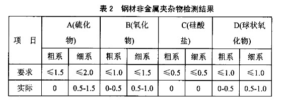 钢材非金属夹杂物检测符合用户指标要求,如表2。检测钢中全氧含量控制在15×10-4%以下,钢材塔形发纹检验合格,UT探伤合格率95%以上,取样经高频探伤检测合格,钢的洁净度达到了用户要求。