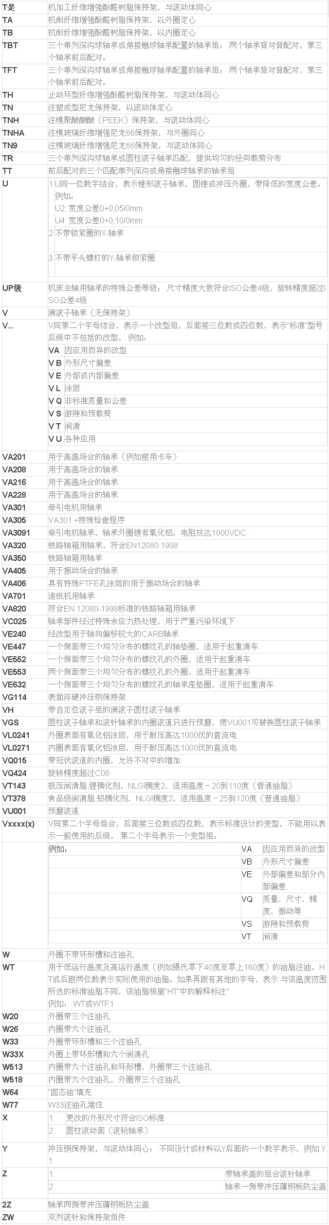 SKF轴承后缀代号T-Z部分说明