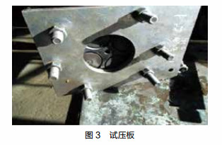 铜套安装到汽缸盖上后,为了检测汽缸盖是否漏水,我们还设计制作了1个试压板。该试压板用厚度为15mm的钢板制作,长度为285mm,宽度为210mm,按照该柴油机汽缸盖螺栓位置加工7个直径为12mm孔。利用柴油机汽缸垫、汽缸盖螺栓、试压板,对汽缸盖下面的水道进行密封。试压板中间开直径为95mm孔,用于观察铜套下端的安装质量。在试压板对应汽缸盖水道孔处设置1个充气孔,以便试压时充入压缩空气。