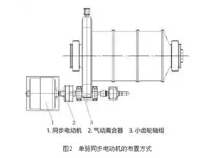 单驱同步电动机的驱动方式在国内的矿业市场占有Z大的份额,并且使用时间较长,其布置方式如图2所示。该驱动系统的配置有同步电动机、气动离合器、小齿轮轴组和大齿轮。大齿轮通过高强度螺栓把合安装在筒体上,依靠大齿轮的转动,带动磨机筒体做旋转运动。