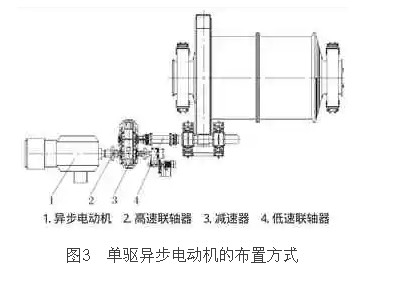 单驱异步电动机在国内的化工行业应用Z多,较早的金属矿山也有应用,但其所适用的磨机规格普遍较小,其布置方式通常如图3所示。该驱动系统的配置有异步电动机、减速器、小齿轮轴组和大齿轮。大齿轮通过高强度螺栓把合安装在筒体上,依靠大齿轮的转动,带动磨机筒体做旋转运动。