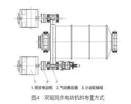 (1)同步双驱传动系统该系统每侧都在同一轴线安装,布置方式与同步单驱相同。启动时,首先电动机空载启动,达到正常转速后,气动离合器充气抱闸,拖动齿轮轴运行。磨机停车时,直接打开气源,脱开离合器,磨机即可停车。磨机停车时,电动机勿须停机,没有中间环节,传动效率高。该系统属于高品质、长寿命运行结构。