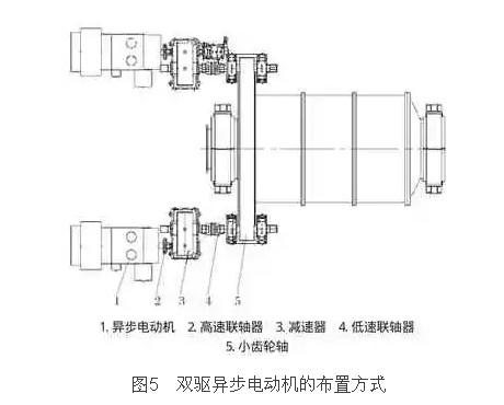 双驱异步驱动系统布置形式如图5所示,配置2套传动系统对称布置在大齿轮的两侧,每个系统包括异步电动机、高速联轴器、减速器、低速联轴器和小齿轮轴。同样,双边驱动的技术难点是同步性,当前主要采用双水电阻启动器控制启动,启动后采用机械自平衡的方式进行调节。