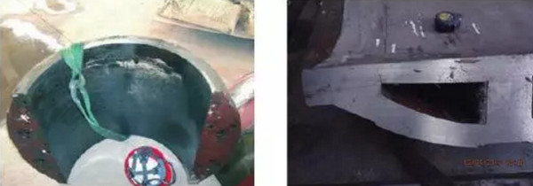 解剖切割失效的球面瓦,发现冷却水道已发生明显的偏移,这说明在铸造成型时,砂芯的固定出现了问题,铁液在充型过程中,其冲力和浮力导致砂芯摆动偏离,见图2。