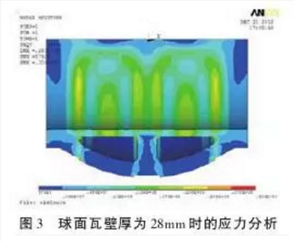 针对上述问题,首先采用ANSYS软件对球面瓦水槽不同壁厚及其相对应的应力进行分析;其次,对优化后的球面瓦铸造工艺流程进行跟踪分析;Z后,对球面瓦的结构进行优化,保证使用可靠性和使用寿命。