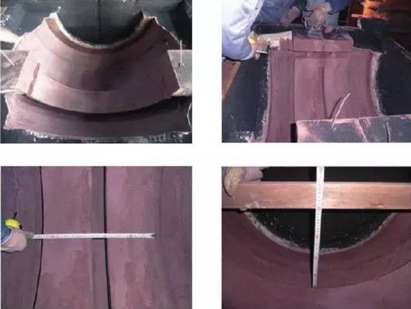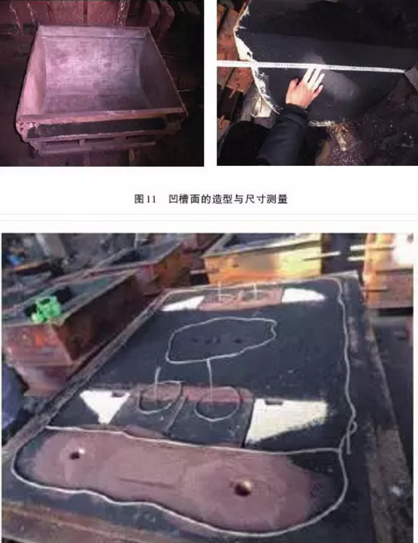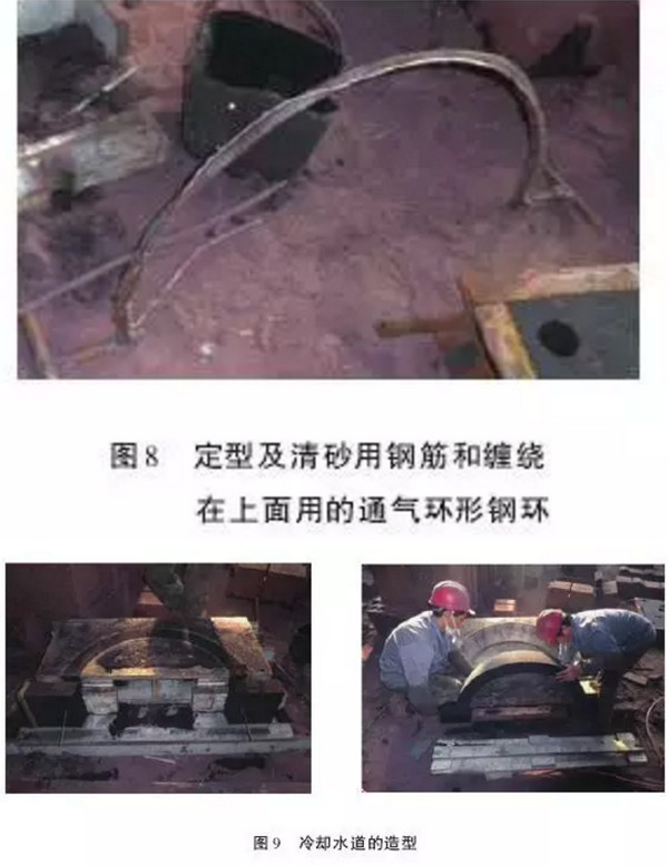造型完毕,涂刷上涂料烘烤干后,放置在球面瓦整体内腔内,进行步组合。组合完毕后,对相关尺寸进行测量,测量冷却水道砂型的Z上面到圆心为395mm左右,设计值为R395mm,即凹槽面壁厚的个半径尺寸是达到设计要求的。图10中排第二张照片中冒出来的“细绳”就是缠绕在钢筋上用于通气的环状弹簧空心钢环。