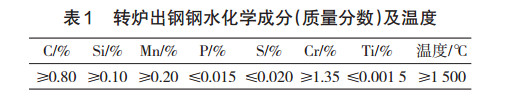 3)转炉采用顶底复合吹炼,双渣法冶炼、挡渣出钢等工艺。可以有效降低钢中Ti和P含量,提高钢水纯净度,可以改善转炉冶金条件,减少吹损,提高金属收得率,提高生产效率。转炉通过强化操作,控制终点成分以及出钢温度。
