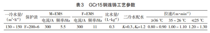 9)精炼过程合理控制钢水温度,保证连铸过热度控制在15~25℃。连铸采用全程保护浇注,钢包到中间包采用长水口,中间包到结晶器采用浸入式水口,中间包加覆盖剂防止钢水二次氧化,结晶器添加保护渣,吸附夹杂物,防止钢水氧化[2]。采用结晶器电磁搅拌(M-EMS)+末端电磁搅拌(F-EMS),保证钢质纯净度,提高组织均匀性。制定合理的连铸工艺,连铸工艺参数见表3。