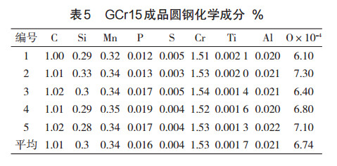 GCrl5轴承钢的纯净度主要体现在有害残余元素、非金属夹杂物、气体含量和组织、均匀性,它们的综合作用决定了材料的Z终使用性能[3]。转炉流程试验高纯净度GCrt5轴承钢,共计生产5炉,轧制成Φ60mm的圆钢5个批号。每炉钢各元素含量均达到设计要求,且波动范围很小,见表5。