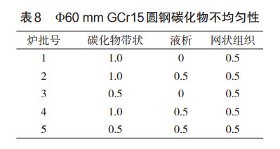碳化物网状在淬火后的横向试样上评定,试样抛光后用4%的硝酸酒精腐蚀放大500倍评级;碳化物带状在淬火后的纵向试样上评定,试样抛光后深腐蚀,放大100倍或500倍评定碳化物聚集程度、大小和形状;碳化物液析在淬火后的纵向试样上评定,试样用4%硝酸酒精溶液侵蚀后放大100倍评级。试验GCrl5轴承钢轧材重点对带状、液析进行了检验,结果见表8。碳化物带状平均1.0级,液析0.5级,均达到了设计要求,提高了钢质纯净度。试样经淬火、回火、研磨抛光、4%硝酸酒精腐蚀后,利用Zeiss显微镜观察碳化物组织,液析0.5级,带状1.0级,网状0.5级,满足工艺要求,达到设计要求。可见连铸低过热度(15~25℃)浇注可以减少碳化物偏析,再通过高温加热扩散,将连铸坯加热至1200~1230℃,保证足够的加热时间,使碳化物偏析充分溶解扩散,达到了降低液析级别的目的[5]。