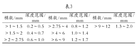 4.3.2严格执行热处理工艺。对热处理工艺的正确选择及对其质量的严格控制,意义在于改良和提升齿轮材料的内在品质,同时弥补了国内合金钢材料性能的不足,从而保证齿轮的使用性能和寿命。FZAD148B减速机中的齿轮渗碳淬火环节中需要重点把控的是高速级齿轮副的有效渗碳层深,齿轮的渗碳层深度可以根据模数按表3所推荐的数值选用:高速级齿轮副的模数为2,由表中得出渗碳层深为0.4~0.7mm,结合几何计算得出齿轮的分度圆齿厚约为3.14mm,这就要求该级齿轮副的渗碳过程要做到准确无误。如果渗碳层深过深,齿厚容易淬透,齿轮脆性增加,削弱其弯曲强度;而如果渗碳层深过浅,则在磨齿过后不易保证其硬化层深,从而削弱其接触强度。因此这个环节的质量直接关系到齿轮副的实际强度。