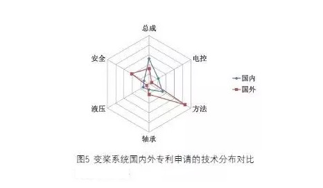 图5显示了变桨系统国内外专利申请的技术分布对比雷达图,其中申请量按照百分计算。从图中可以看出,在变桨系统的七大技术分支中,国内外Z关注的技术点不同。首先,国内申请人较为关注变桨装置总成,占总申请量的26%;而国外申请人对变桨控制方法的关注远远超出了其他技术分支,占到总申请量的43%。进一步对这些申请进行详细分析后可以看出,上述国内申请主要涉及变桨装置总体结构的改进,而国外申请更加关注独立变桨控制方法、根据信号执行变桨控制的方法等。其次,国外申请非常关注变桨系统在安全和可靠性方面的改进,涉及该方面的申请量所占比重很大,达到21%;而国内对这方面的关注较少,仅占总申请量的6%。另一方面,国内申请人较为关注的电控、液压变桨系统则少有国外申请。
