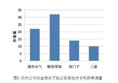从图6中可以看到,这四家公司均申请了独立变桨技术专利。特别是维斯塔斯公司,作为专门致力于风能利用研究的一家公司,以32件与独立变桨技术相关的专利申请量遥遥领先于其他公司。这主要是由于维斯塔斯公司供应的产品大部分为单机容量在兆瓦级以上的大型风电机组,而目前绝大多数大型机组均采用了独立变桨技术。