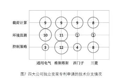 图7显示了四大公司独立变桨专利申请的技术分支情况。经过对比分析发现,这些申请主要涉及三个方面: