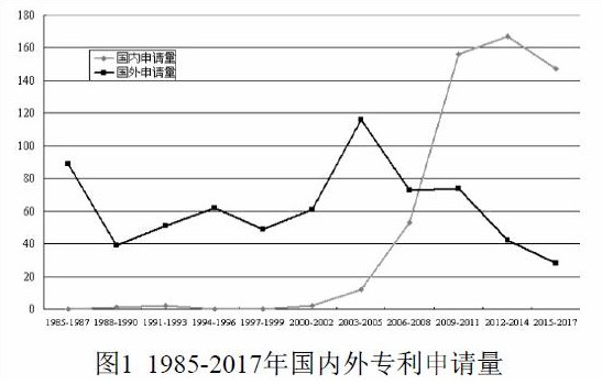 从图1可以看出,回转工作台的发展在国内与国外并不同步,二者专利申请量的态势略有差别。