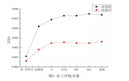 选用含钛低的合金,保证进精炼钛含量达标。使用不同合金时各环节钛含量见图3。