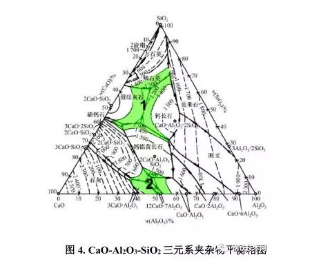 区域1熔点低于1400℃,其成分范围SiO2为30%~75%,Al2O3为5%~40%,CaO为5%~55%;区域2熔点低于1500℃,其成分范围SiO2为0~17%,Al2O3为30%~55%,CaO为40%~60%[2]。