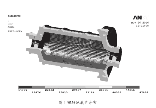 作用在Φ5.5×8.5m溢流型球磨机回转体上的载荷,主要有矿浆、磨矿介质、大齿轮、衬板、回转体自重。采用等效密度的方法简化回转体载荷。满载静止工况下,假设物料和磨矿介质在回转体内是均匀分布的,对回转体的正压力类似于水压力。正压力施加到SURF154单元上,然后传递到回转体上。在ANSYS中,满载静止工况的加载如图1(回转体载荷分布)所示。