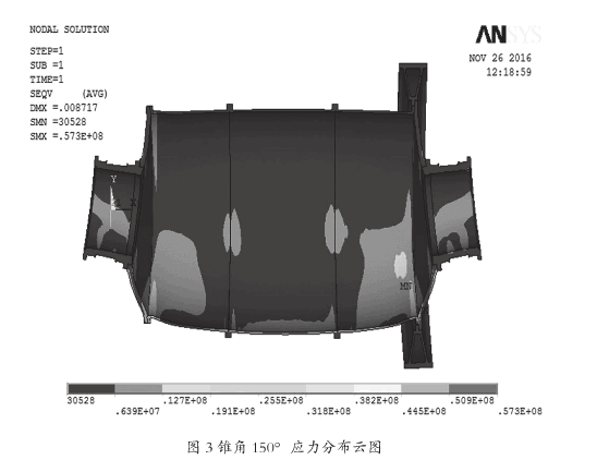 在球磨机回转体其他技术参数不变的情况下利用有限元软件,分别分析了端盖锥角135°和150°时球磨机回转体的应力变化情况。图2和图3分别为端盖锥角135°时球磨机回转体的应力分布云图和端盖锥角150°时球磨机回转体的应力分布云图。从图中可以看到端盖锥角135°时球磨机回转体的Z大应力为50.6MPa;端盖锥角135°时球磨机回转体的Z大应力为57.3MPa。所以在球磨机回转体其他技术参数不变的情况,端盖锥角135°的回转体结构优于端盖锥角150°的回转体结构。端盖锥角135°的回转体结构安全系数更高。
