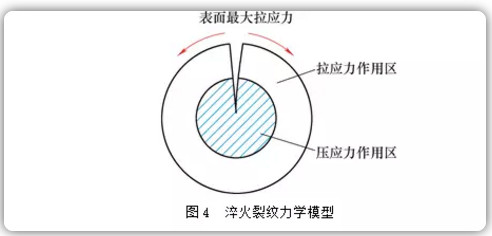 该曲轴裂纹为典型的淬火裂纹中的纵裂,纵裂通常是在工件完全淬透,由组织应力造成。纵裂形成的应力-力学条件是在零件表面上的Z大拉应力超过材料的断裂强度,纵裂产生的力学模型与组织应力的原因一致,即:在淬火冷却初期,零件表层比心部先转变成马氏体,随后零件心部马氏体相变是在外层马氏体限制下进行的,而马氏体相变会发生体积膨胀,于是心部金属给外层金属扩张作用,在外表面引起Z大拉应力,如前所述,组织应力的切向应力显著大于轴向应力,当这一应力超过材料的断裂强度便会发生纵裂。力学模型见图4。由于部分曲轴小头表面存在锻造伤,使小头部位产生应力集中,增大了组织应力,促进了纵裂的产生;而较高的碳含量和较高的合金元素含量也增加淬裂的倾向。