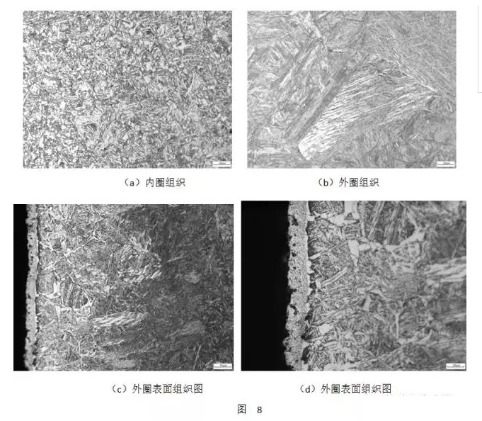 图7a为钢背内圈附近的晶粒度照片,其晶粒为8级,而7b为靠近外圈的晶粒度图片,晶粒为3~4级。同时其内外圈的组织也存在较大差异,如图8所示。