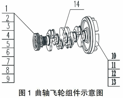 ⑶将所平衡的曲轴样件、飞轮总成样件以及发动机要求装配的曲轴齿轮、曲轴皮带轮轮毂、曲轴皮带轮等按工艺要求安装,组装成曲轴飞轮组件;