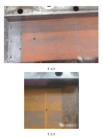 (3)采用快速修复方案彻底处理故障。①拆解、清洗和检查。拆下大拖板,清洗导轨面,导轨面为贴塑导轨,如图1所示,明显拉伤有沟槽,且靠近两端处拉伤较为严重,进一步检查,贴塑导轨无脱落现象,符合上述方案适用范围。②实施步骤。按照上述实施工艺内容进行处理,效果如图2所示。图2a为切除70mm左右宽度范围内的贴塑导轨,清理打毛,钻孔后的照片,图2b为70mm范围内涂塑后的照片。
