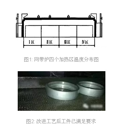 现场生产情况如下:淬火温度过,搅拌泵和风扇布置不当等。现场立即着手改造布局,下调网带炉Ⅱ区、Ⅲ区的淬火温度。