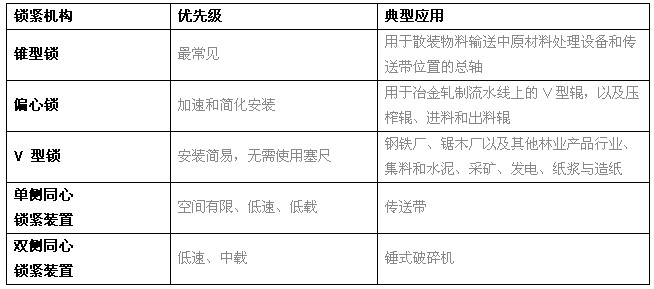 正确的锁紧机构可以简化并加速带座滚子轴承单元的安装与维护,并且有助于确保运行无故障。对于分体式带座滚子轴承单元,通常选择锥形套筒的锁紧机构——它可以让轴承在轴上的轴向位置更加灵活,并且锁紧可靠。对于一体式带座滚子轴承单元而言,选项则丰富得多,主要取决于优先级、轴的设计和安装考虑。下表描述了常用的锁紧机构以及它们所适用的代表性应用场合。