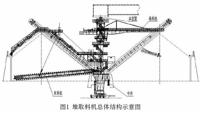 目前,堆取料機具有占地小、存储量大、清洁环保等特点,广泛应用在煤矿、码头、冶金、化工、电厂、水泥等行业的圆形料场中。基本功能是将物料进行堆放、混匀取料。由于来料栈桥的执胀冷缩对堆取料机产生的推拉力,对堆取料机的各部件造成了损坏,轻微的在现场修正,严重的更换部件重新制作。既提高了设备成本,又消耗了大量的人力、物力。本装置就是为解决这个问题而设计的。