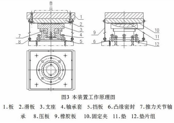 本装置应用在堆取料机中,用于调整来料栈桥与堆取料机回转机构联接处,由于来至来料栈桥的执胀冷缩而导至堆取料机所受的推拉力,对堆取料机部件造成损坏。参照附图2,其主体结构由(1)板、(2)滑板、(3)支座、(4)轴承套、(5)挡板、(6)凸缘密封、(7)推力关节轴承、(8)压板、(9)橡胶板、(10)固定夹、(11)垫、(12)垫片组以及螺钉、螺栓、垫圈组成。(4)轴承套与堆取料机回转机构支座用螺栓联接加以固定,轴承套下面加上垫片,保证轴承转动的灵活性。(1)板与(2)滑板、(3)支座、(4)轴承套、(5)挡板、(7)推力关节轴承、(11)垫、(12)垫片组用螺栓组装一体,保证轴承转动的灵活性,使(2)滑板能够在(4)支座上滑动,使来料栈桥在堆取料机上的压力有释放的空间,保证回转机构只受来料栈桥的重力,而不受推拉力。轴承安装调整好后,拆下(10)固定夹,然后安装(6)凸缘密封、(8)压板、(9)橡胶板。用(6)凸缘密封将(4)轴承套密封好。四周用橡胶板将轴承密封好,防止灰尘、杂质、雨水等进入轴承中。