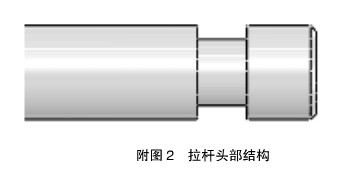 附图1中序1为油缸、序2为连接套、序3为拉杆、序4为挡块、序5为压套工装、序6为框架。工作原理:将轴套套在压套工装上,油缸向内收缩两个压套工装同时向内将轴套压在工作装置内。拉杆式压套工装其主要受力部位为其端部,头部结构如附图2,拉杆端部凹槽截面直径小于拉杆直径,长时间使用后易断裂。