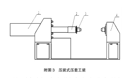 附图3中序1为油缸、序2为连接套、序3为压套工装、序4为框架。工作原理:将轴套套在压套工装上,油缸向外伸两个压套工装间距缩小将轴套压在工作装置内。压装式压套工装其主要受力部位为框架,所以可以通过加强框架的强度避免工装变形损坏。此种方法同拉杆式压套工装相比可以巧妙的避免拉杆的损坏。适用于小型挖掘机工作装置轴套安装。