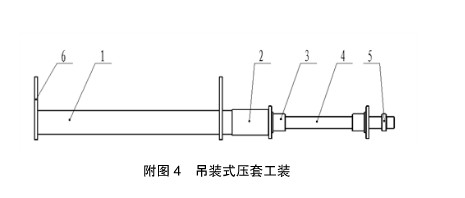 附图4中序1为油缸、序2为连接套、序3为压套工装、序4为拉杆、序5为挡块、序6为吊环。工作原理:使用行车将工装直接吊起,将轴套套在压套工装上,油缸向内收缩两个压套工装同时向内将轴套压在工作装置内。将轴套套在压套工装上,油缸向内收缩两个压套工装同时向内将轴套压在工作装置内。此种方法可避免将工作装置吊起,直接吊起油缸安装,大型或超大型挖掘机其工作装置重量较大吊装困难时,可使用此种方法安装轴套。