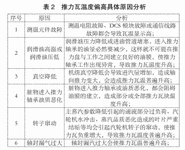 推力瓦在汽轮机中的作用主要有两个方面:(1)确定转子膨胀的死点,并保证动静叶片轴向间隙;(2)平衡机组剩余轴向推力。推力瓦温度主要由润滑油温、负荷、汽轮机通流间隙等决定。推力瓦温度异常的原因如表2所示。