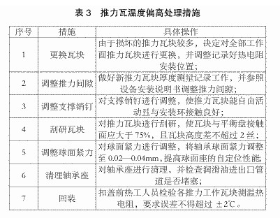 日常对推力瓦进行检修时,从检修情况来进行分析,通常个别推力瓦块的摇摆度不够或是顶死了推力瓦自定位能力就会下降,同时推力轴承的球面自定位能力出现不足所以导致推力瓦的瓦块和推力盘斜角同样出现不足,进而对油膜的正常建立进行了破坏。油膜遭到了破坏就会增加运行摩擦力,摩擦生热就会引起瓦块温度偏高的情况。经过检修,各推力瓦块的温度Z终应达到大于60℃并且小于70℃。其处理措施如表3所示。