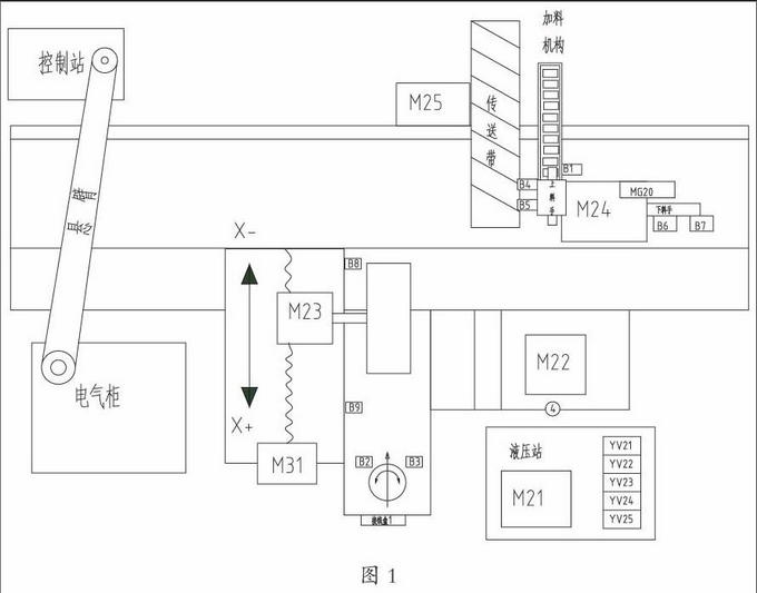 如图1为设备结构示意图,M21为液压站电机,M22为润滑泵电机,M23为砂轮变频电机,M24为工件头架电机,M25为下料传送带电机,M31为砂轮横向移动伺服电机。悬臂悬挂操作站可水平旋转,方便对刀和修整,触摸屏安装再操作站上,通过它可以更改参数和监视设备状态。